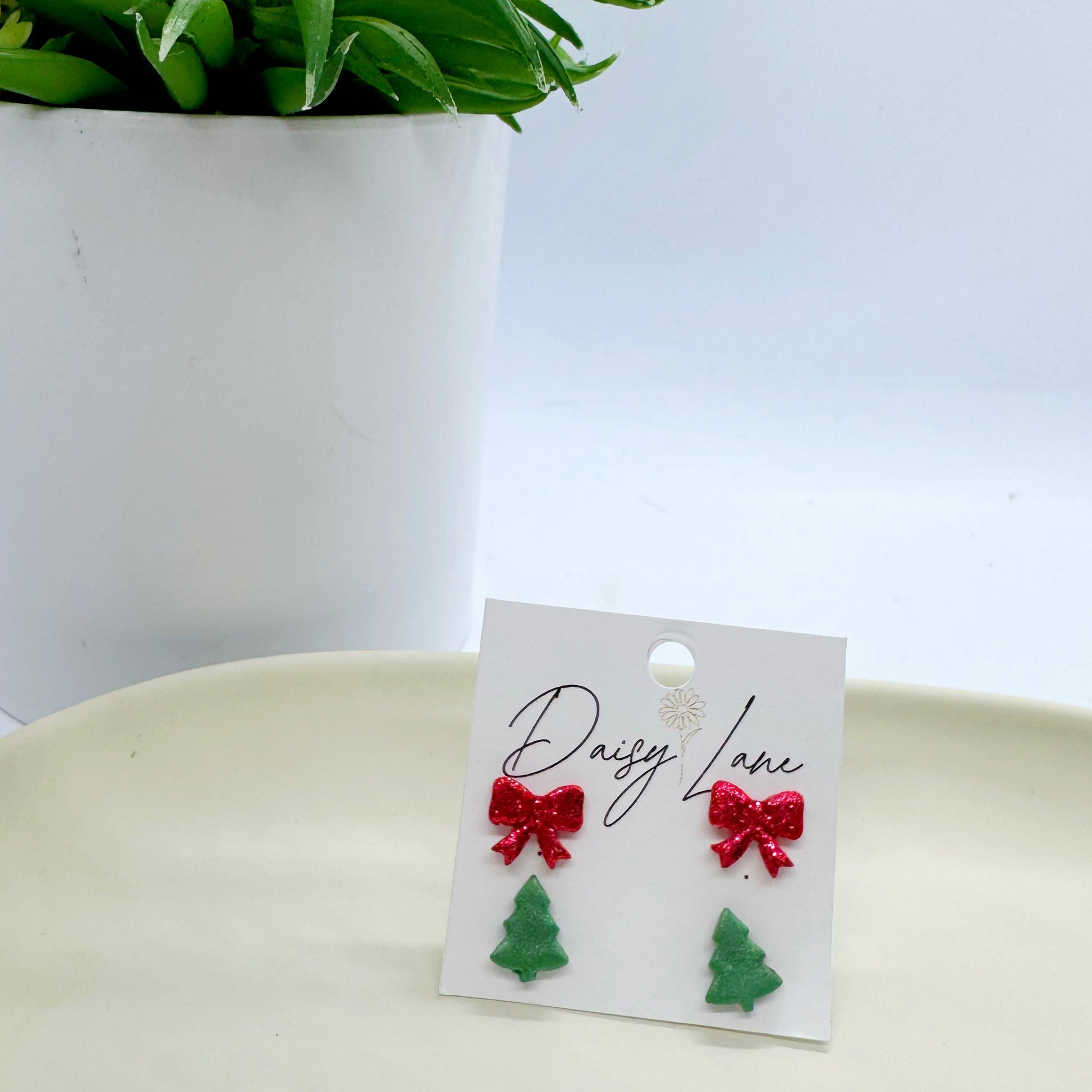 A sweet set of mini holiday studs, made to mix, match, and wear all season long. Each pair features two coordinating designs! Soft, festive, and easy for everyday wear. Lightweight, simple, and perfect for gifting or adding a tiny touch of holiday charm to your look!