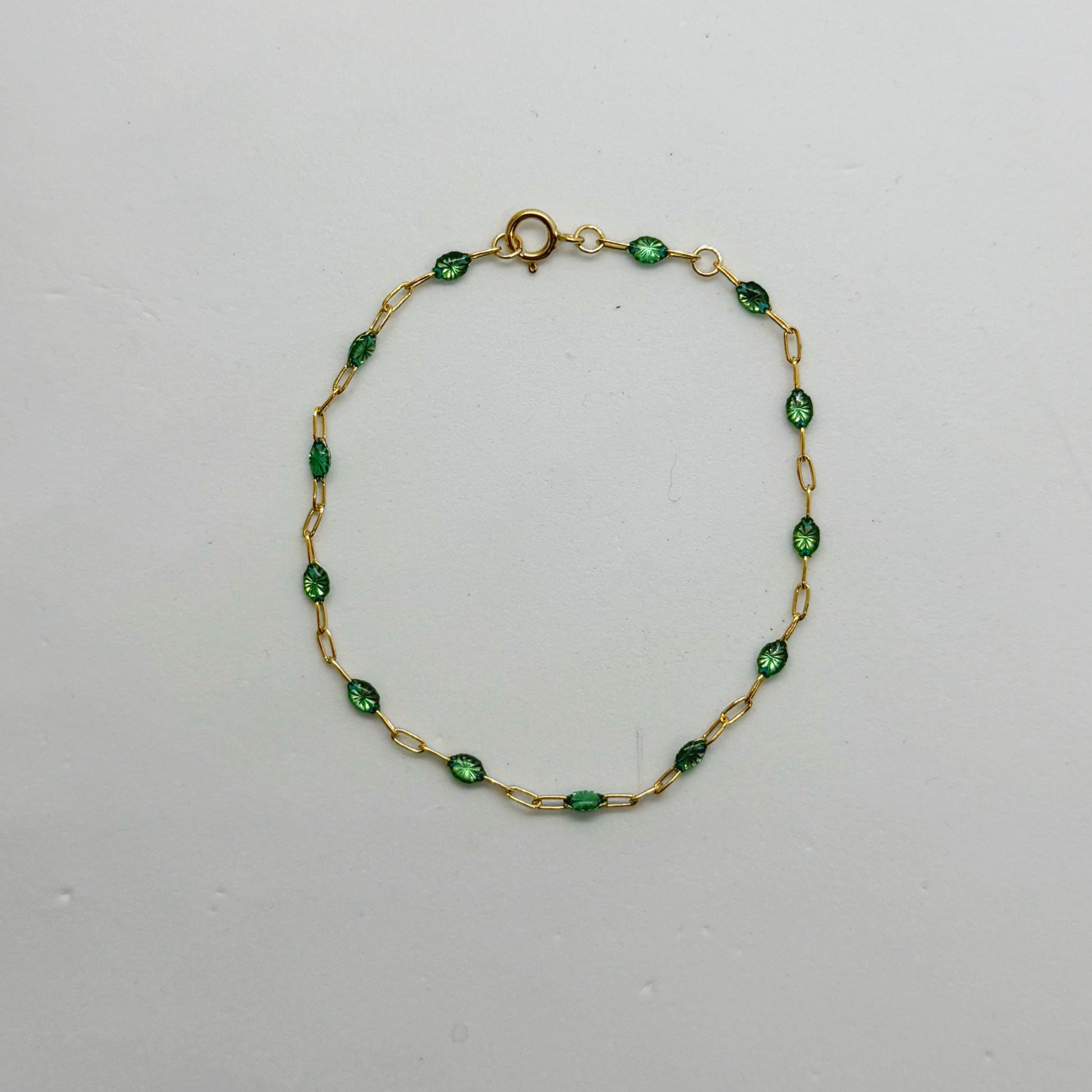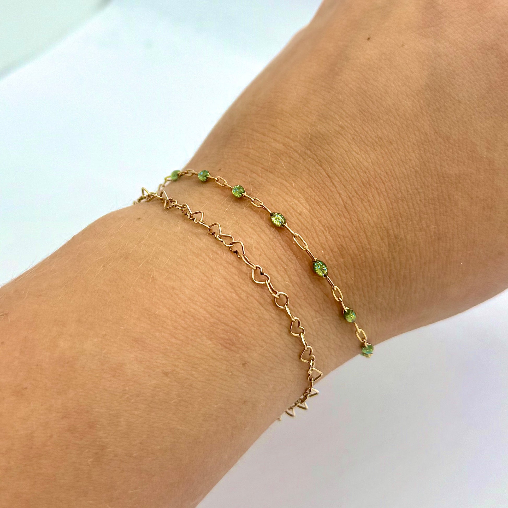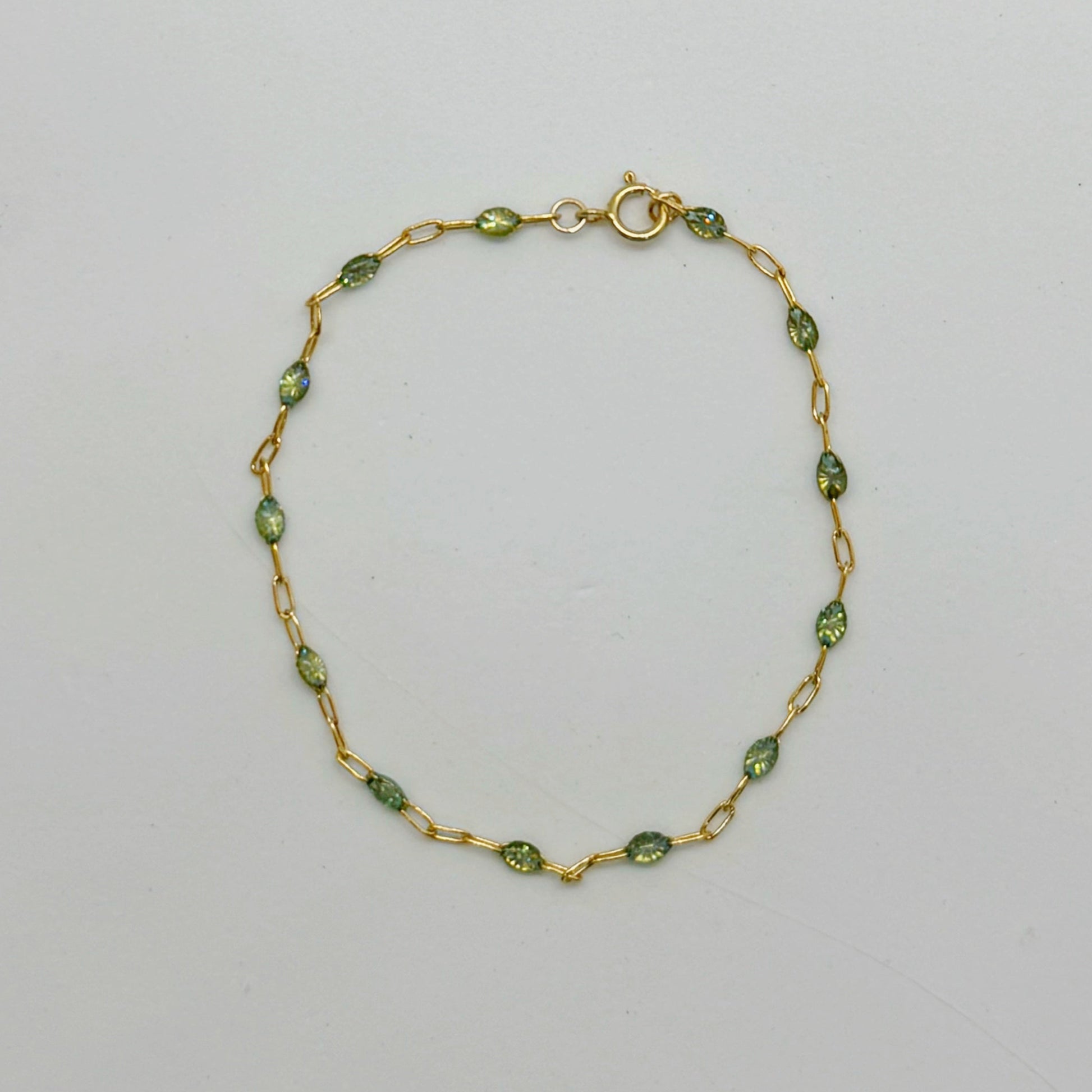 A delicate, dainty bracelet designed for everyday wear. This gold-filled piece features a subtle section of glass beads on a fine chain, adding just the right touch of color and texture. Lightweight, hypoallergenic, and perfect for layering or wearing on its own.