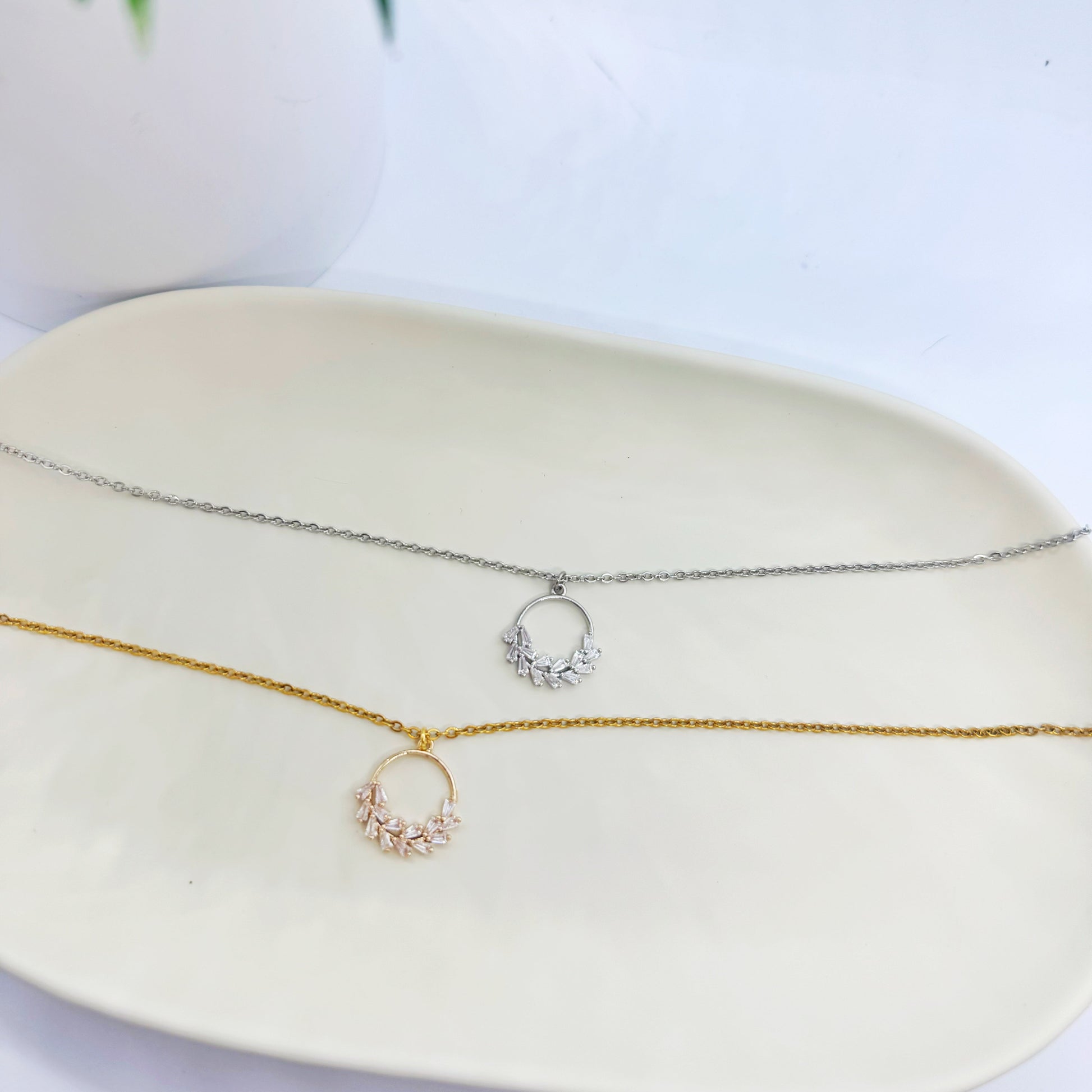 A tiny wreath of leaves on an open circle pendant - soft, romantic, and easy to later. A sweet everyday piece with subtle sparkle.