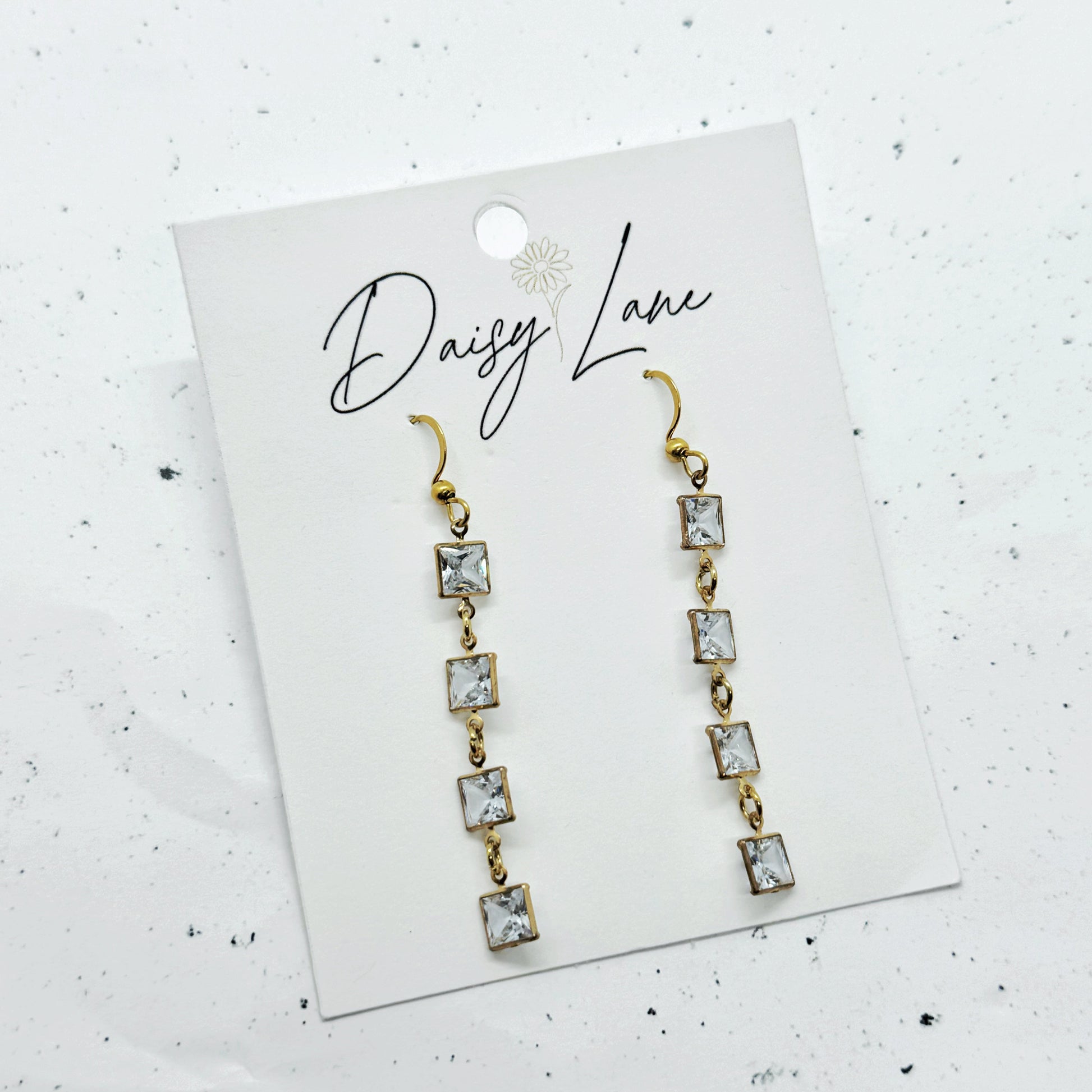 Simone brings the sparkle - a cascading line of square-cut stones for a bold, dramatic look. Lightweight enough for evening wear with the shine for a statement finish. Perfect for weddings, date nights, and everyday sparkle.